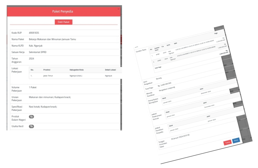 NGANJUK, KORAN-K.com – Merujuk informasi sirup LKPP tahun 2024, diketahui, Sekretariat DPRD Kabupaten Nganjuk menetapkan 2 paket belanja mamin (makanan dan minuman) senilai pagu Rp 5 milyar atau tepatnya Rp 4.950.000.000.