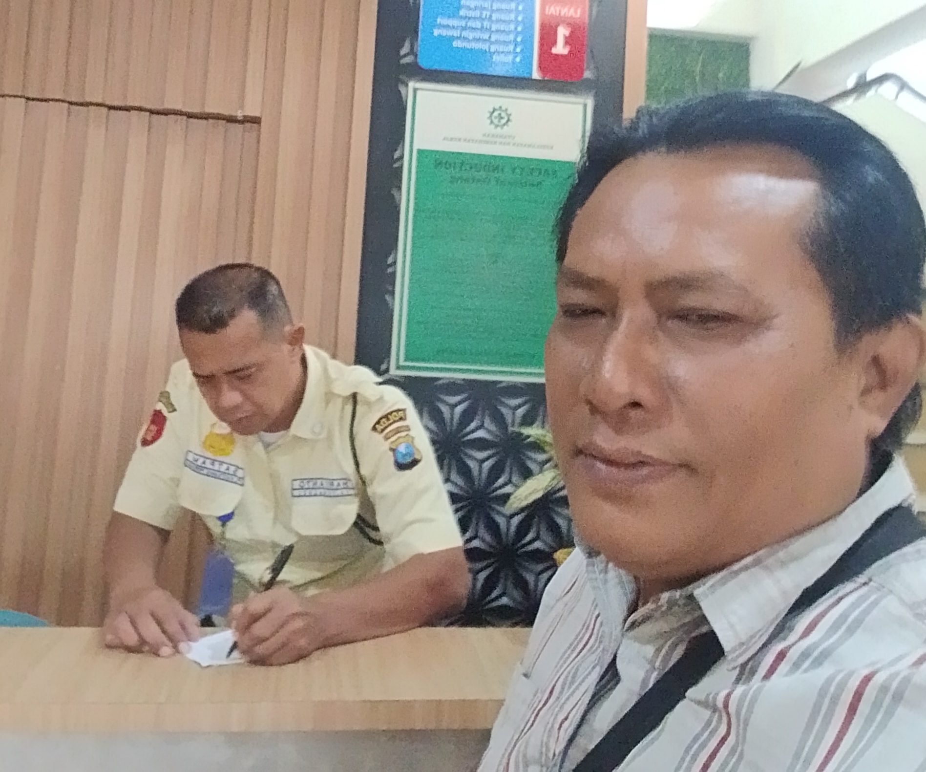 Konfirmasi Berita Mandek di Meja Security. Hariyanto, Security Recepsionis Kantor PLN UP 3 Mojokerto, Menuturkan Petugas Humas Sedang Dinas Luar. (Foto: Koran-k.com)