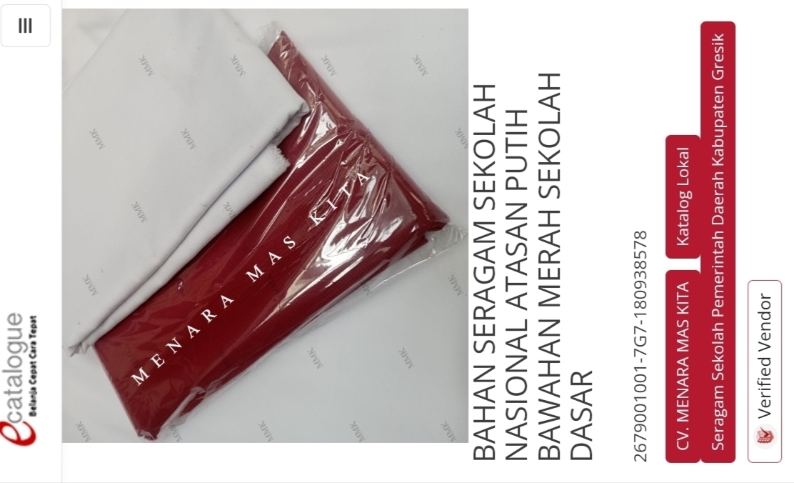 Pertanyaannya, apakah harga segitu terbilang wajar ataukah kemahalan? Merujuk data etalase katalog tahun 2024, diketahui CV Menara Mas Kita hanya menjual kain seragam sekolah berbahan polyester 100 persen.